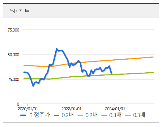 현재 PBR차트는 바닥에 거의 근접하였습니다. 주가 레벨이 3만 원 3만 원 이하면 PBR 0.2로 저평가 구간에 들어섰다고 볼 수 있습니다. 반대 매매 및 금리 인상 이슈로 코스피가 지지부진한 현재, 주가가 3만 원 레벨에 도달하면 추가 매수를 고려하고 있으며, 반대로 주가가 4만 원 정도에 도달하면 익절 할 계획입니다. 다만 이는 개인적인 목표 주가 이므로, 본인의 투자 기록을 위해 작성하는 것으로 매수/매도 추천이 아닙니다.